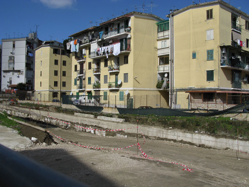 Proseguiamo oltre. In particolare siamo nel punto in cui era presente il ponte della vecchia Ferrovia Alifana in Via Vicinale Piscinola. Inquadratura in direzione Piscinola, dove, dopo esser stato spianato l'intero terrapieno, sono in corso di realizzazione le travi di coronamento delle paratie laterali della galleria. In questo punto la galleria si restringe, per passare da quattro (i due centrali della linea di MCNE ed i due laterali della Linea 1) a due binari.